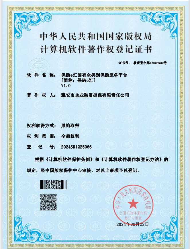 近日,由雅安市擔(dān)保公司開發(fā)完成的《保函e匯國有全類別保函服務(wù)平臺(簡稱:保函e匯)V1.0》軟件通過國家版權(quán)局的最終審查,獲得由中華人民共和國版權(quán)局頒發(fā)的計(jì)算機(jī)軟件著作權(quán)登記證書。